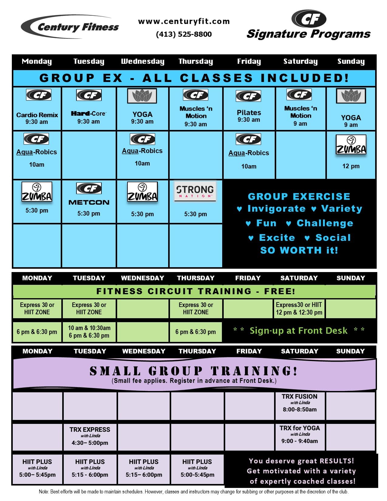 The Group Exercise program at Century Fitness offers so many great ways to move you. Step into our studio and get your heart pumping and your muscles working with our wide variety of Cardio and Toning classes. Make some waves in the pool and let the water work for resistance, fitness, and therapeutic healing in one of our many Aqua Exercise classes. Don’t forget to tune in to your inner-self and enjoy one of our healthy Mind & Body Yoga Classes too!