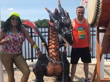 Denise Cividanes and Jeff Dalessio were at the Dragon Boat Festival in Springfield earlier this summer. They warmed up the canoeists with Zumba moves and stretching before they competed in their races. Nice work you two!